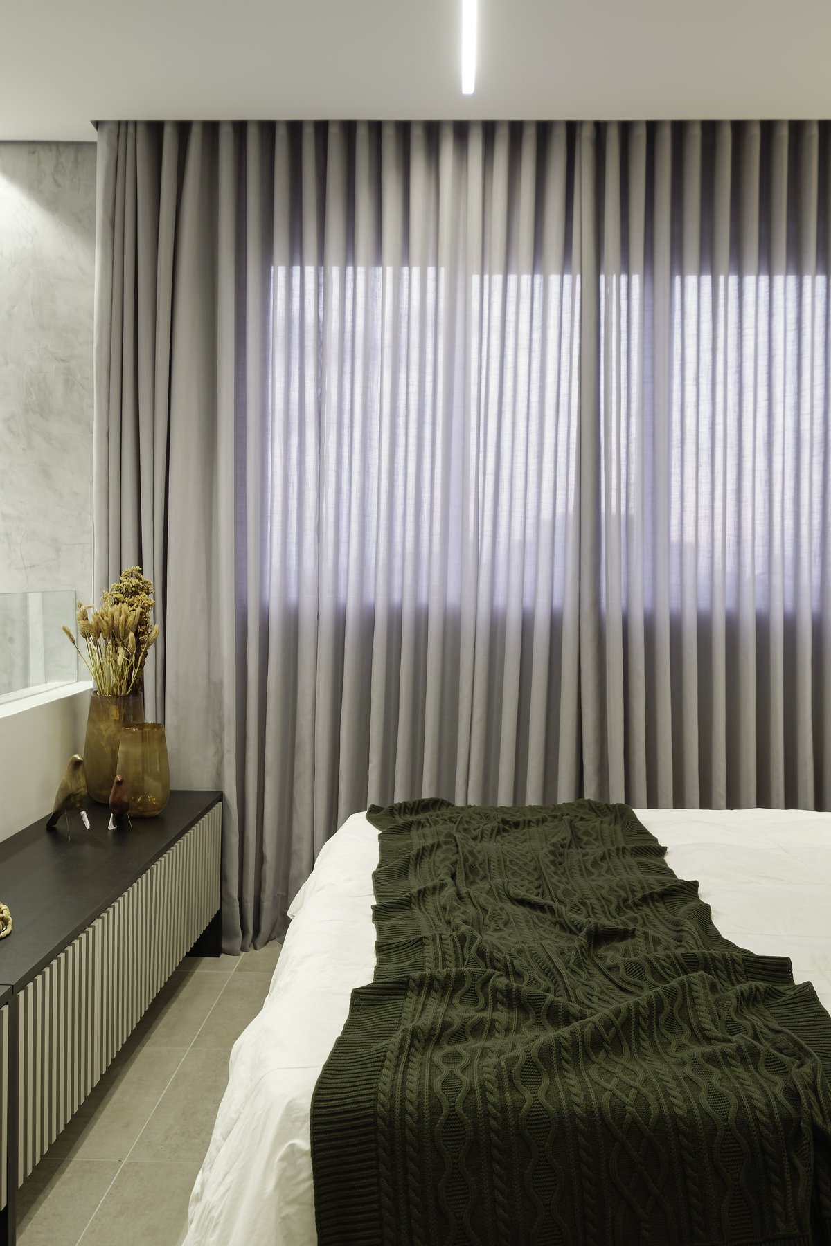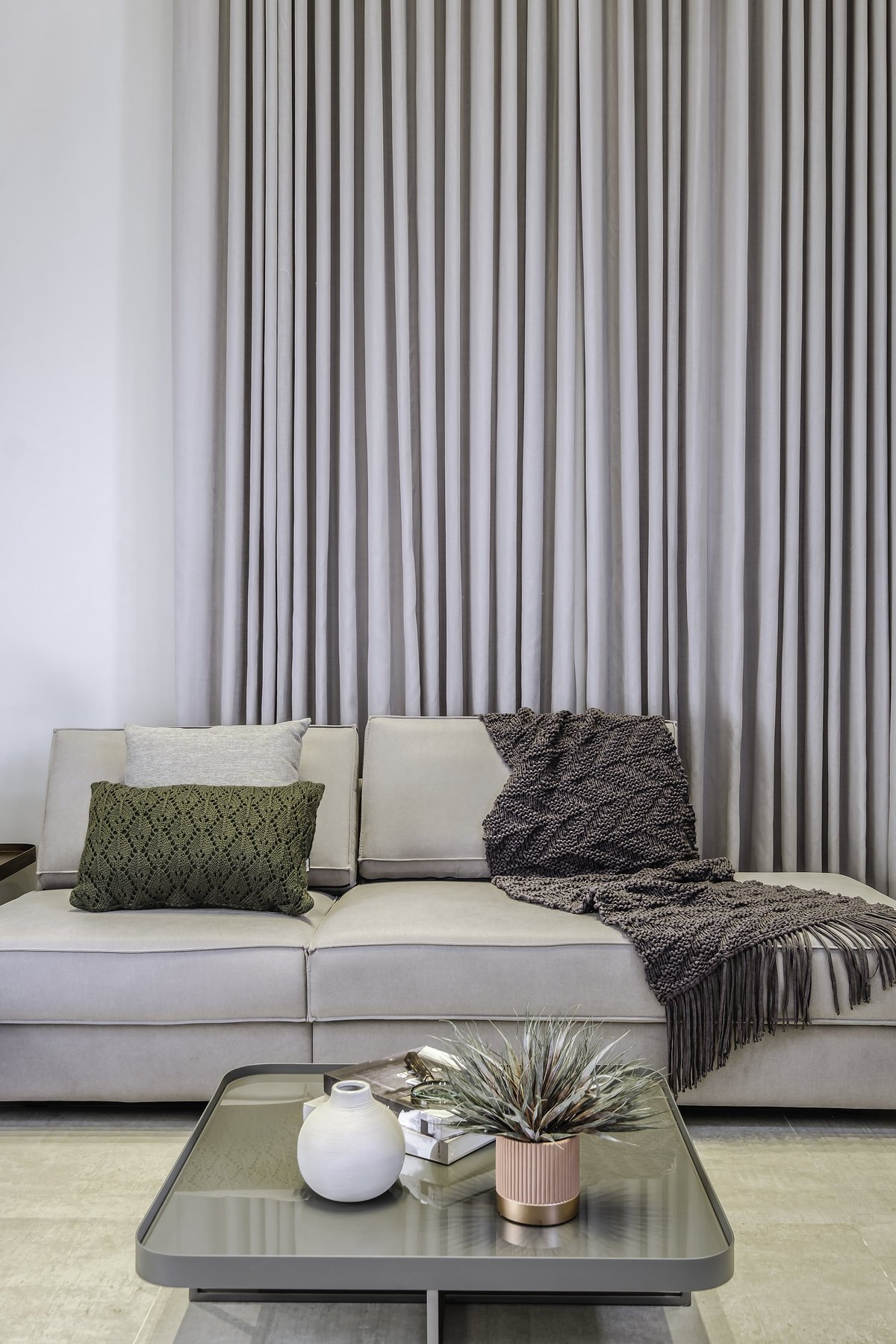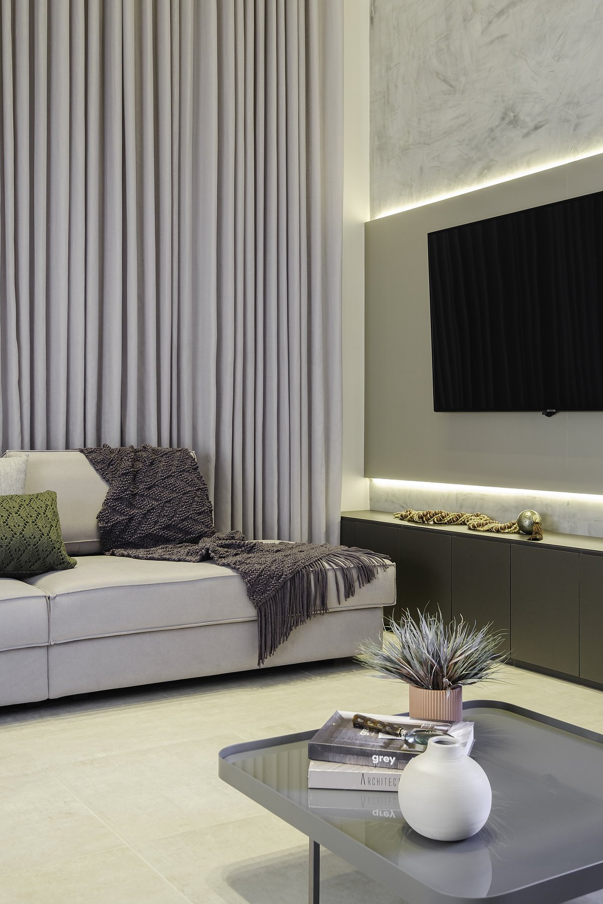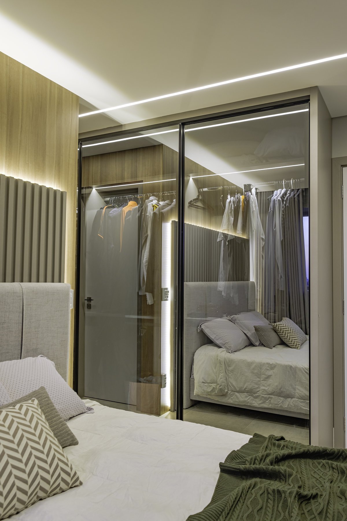 O conceito partiu do minimalismo, trazendo ambientes limpos, funcionais e com design contemporâneo. Mas, ao mesmo tempo, pensamos cuidadosamente no aconchego, porque, depois de uma rotina intensa de trabalho, ele queria chegar em casa e encontrar um verdadeiro refúgio.