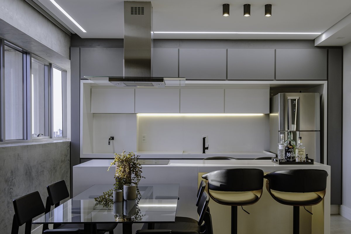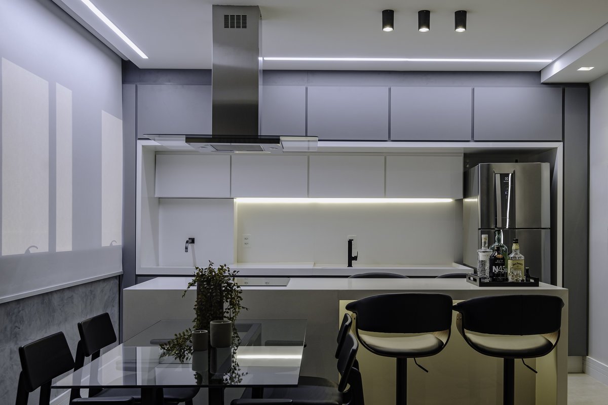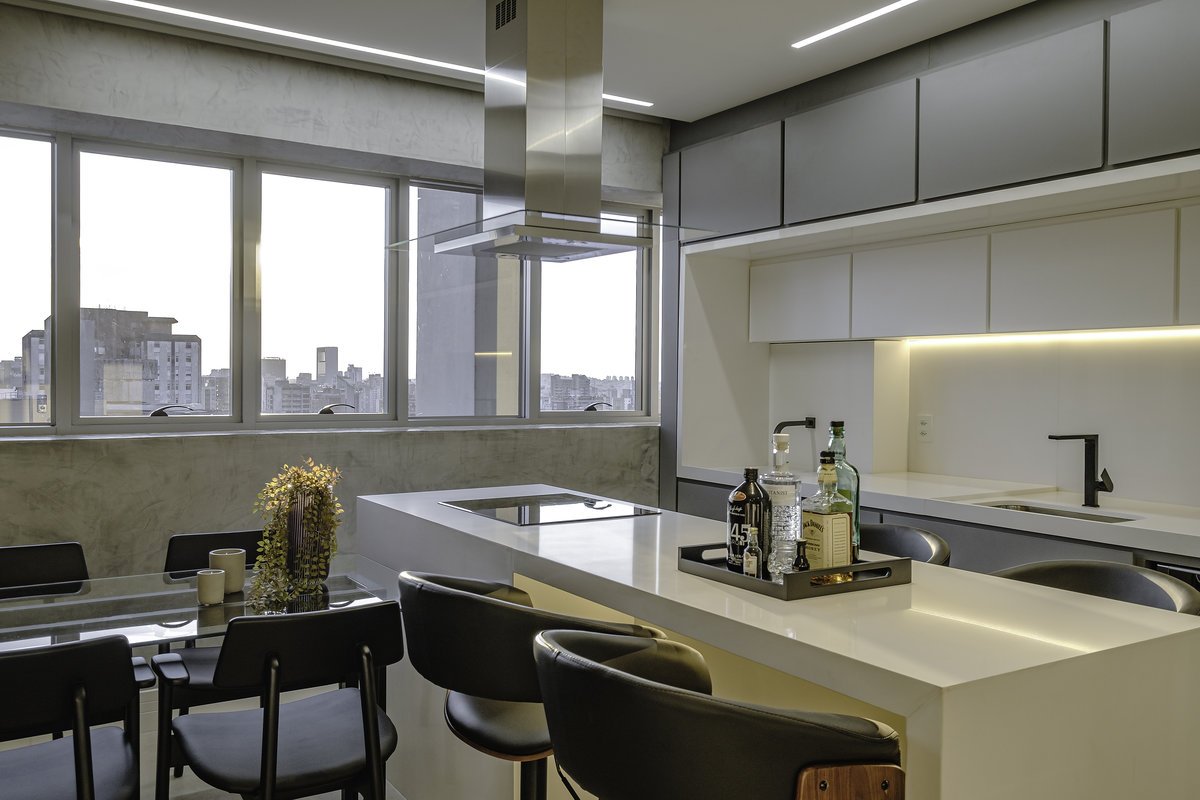 A cozinha com bancada em quartzo branco foi um pedido especial do cliente — um toque de sofisticação e leveza que dialoga com o restante do espaço. Os tons de cinza dominaram a paleta, reforçando a sensação de sobriedade e elegância.