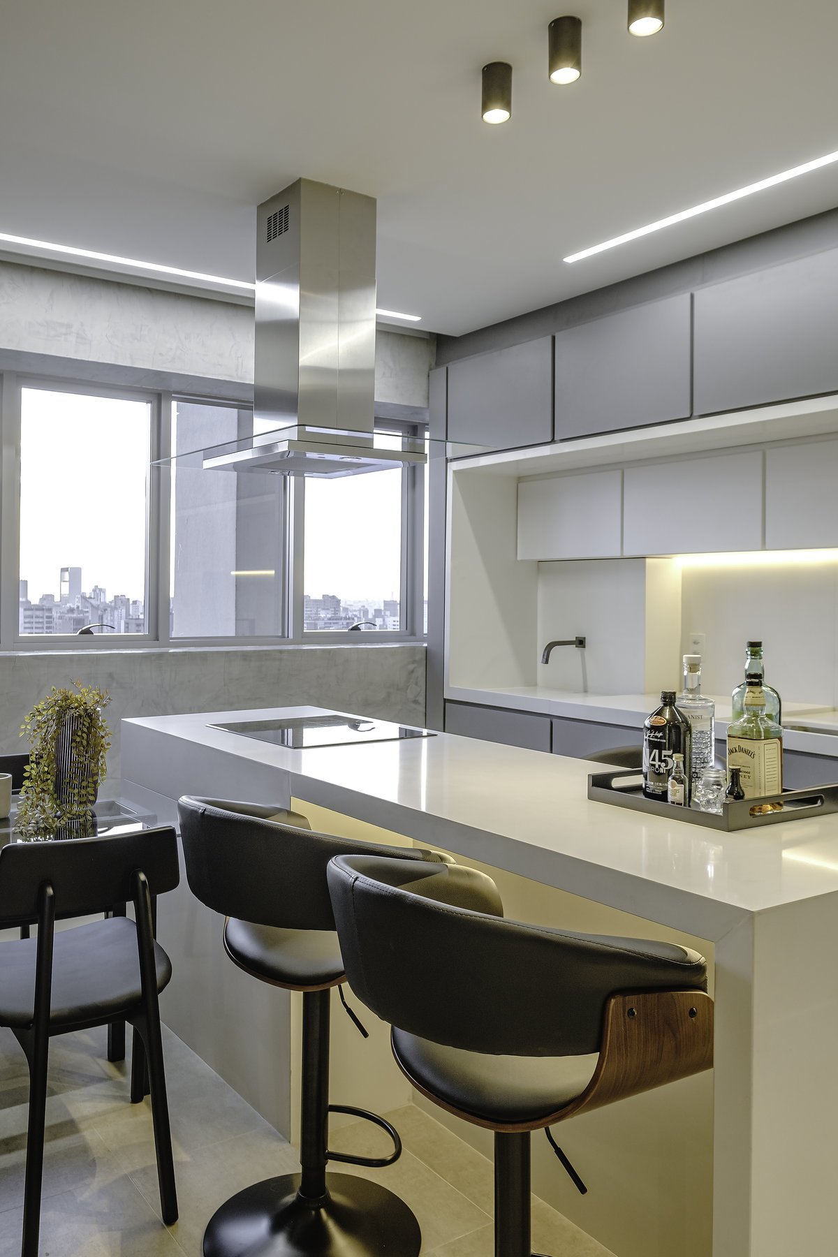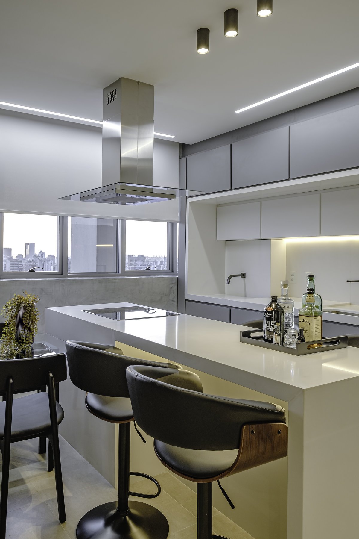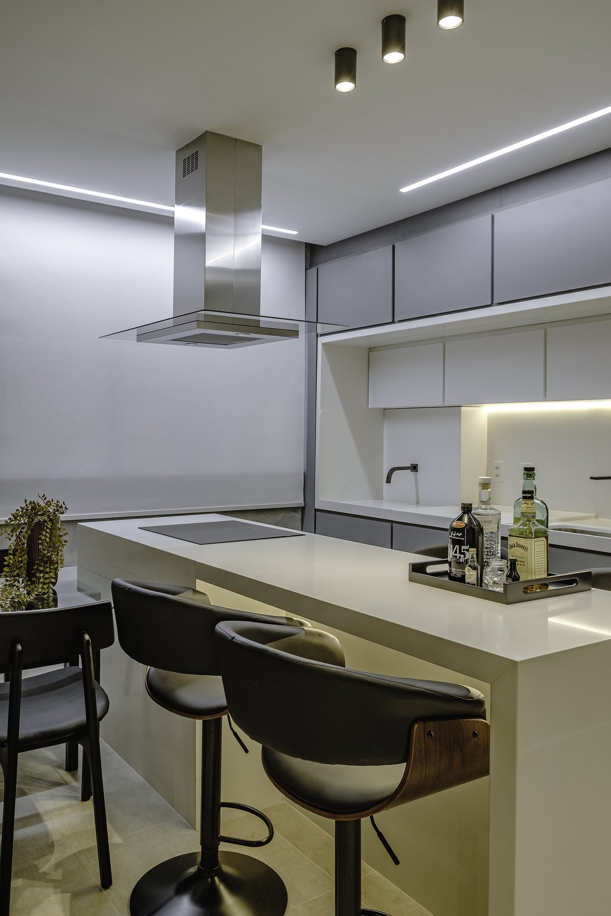A cozinha com bancada em quartzo branco foi um pedido especial do cliente — um toque de sofisticação e leveza que dialoga com o restante do espaço. Os tons de cinza dominaram a paleta, reforçando a sensação de sobriedade e elegância.